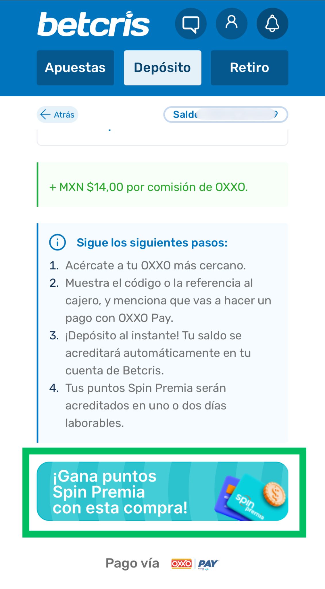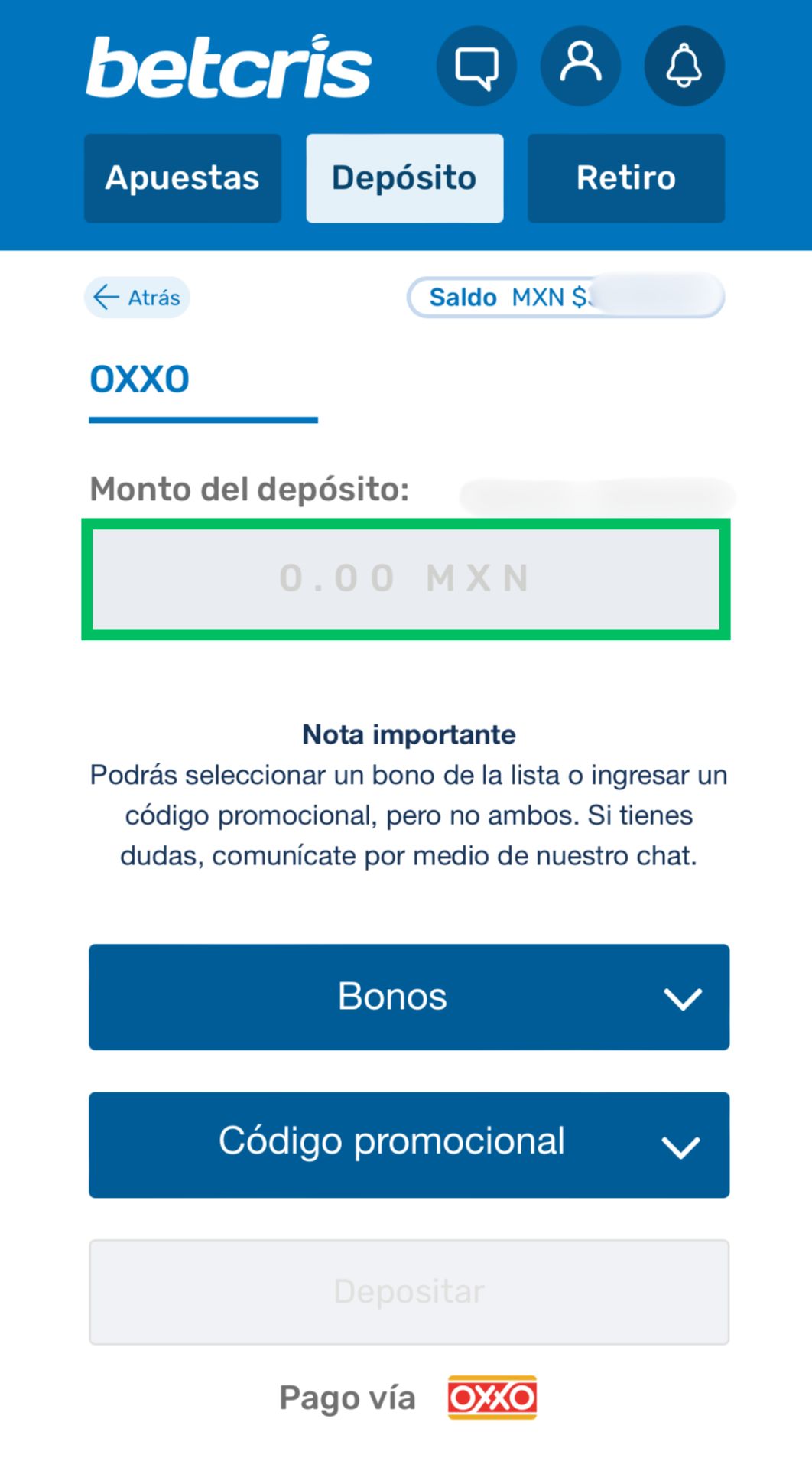 OXXO como método de depósito en tu cuenta de Betcris México. Consulta siempre el Cajero para saber cuáles opciones tienes disponibles.