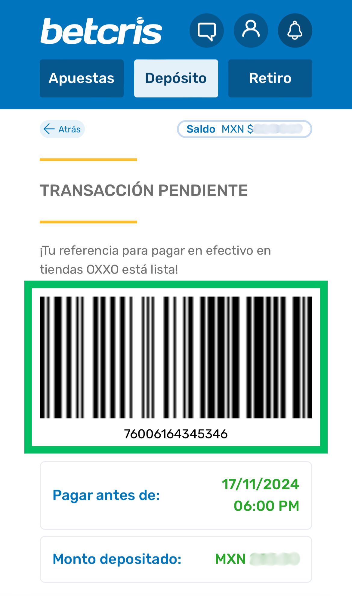 En caso de haber realizado el depósito y éste no se vea reflejado en el balance de tu cuenta Betcris, por favor contacta al área de servicio al cliente mediante Chat en Vivo con el comprobante del depósito a mano para poder revisar lo sucedido.