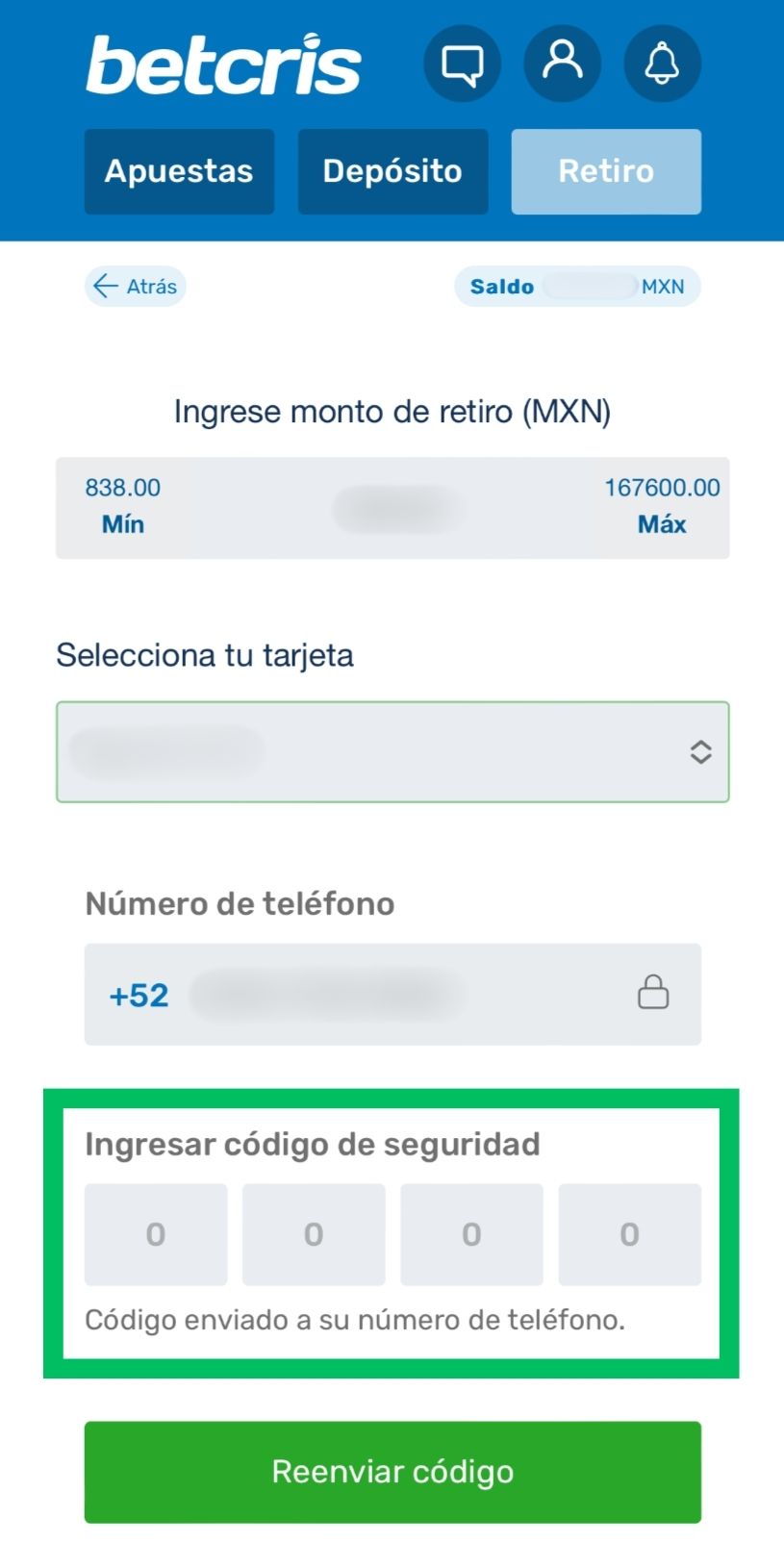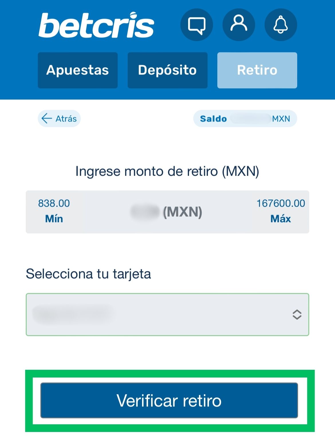 Ten en cuenta que el proceso de retiro puede tardar hasta 30 minutos en completarse. El mismo se verá reflejado en tu estado de cuenta como Betcris.